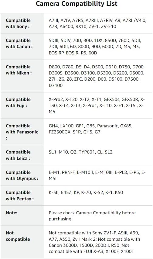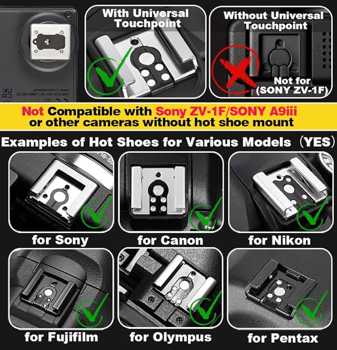 - これらの6つのカメラブランドのホットシューコンタクトは、画像に示されている例と一致する必要がありますのでご注意ください。ご購入前に、画像にあるホットシューコンタクトの例をよく確認し、互換性を確認してください。カメラ互換性に関する警告:Godox IM30ミニマニュアルフラッシュは、Sony ZV-1F、A9III、A99、A77、A350には対応していません。Canon EOS Rebel SL3、250D、T7、1500D、2000D、T100、3000D、4000D、200DII、R7、R6II、R8、R10、R50には対応していません。Fuji X-A3、X100F、X100Tには対応していません。ご購入前に、製品写真の「カメラ互換性リスト」を確認し、適切な互換性を確認してください。