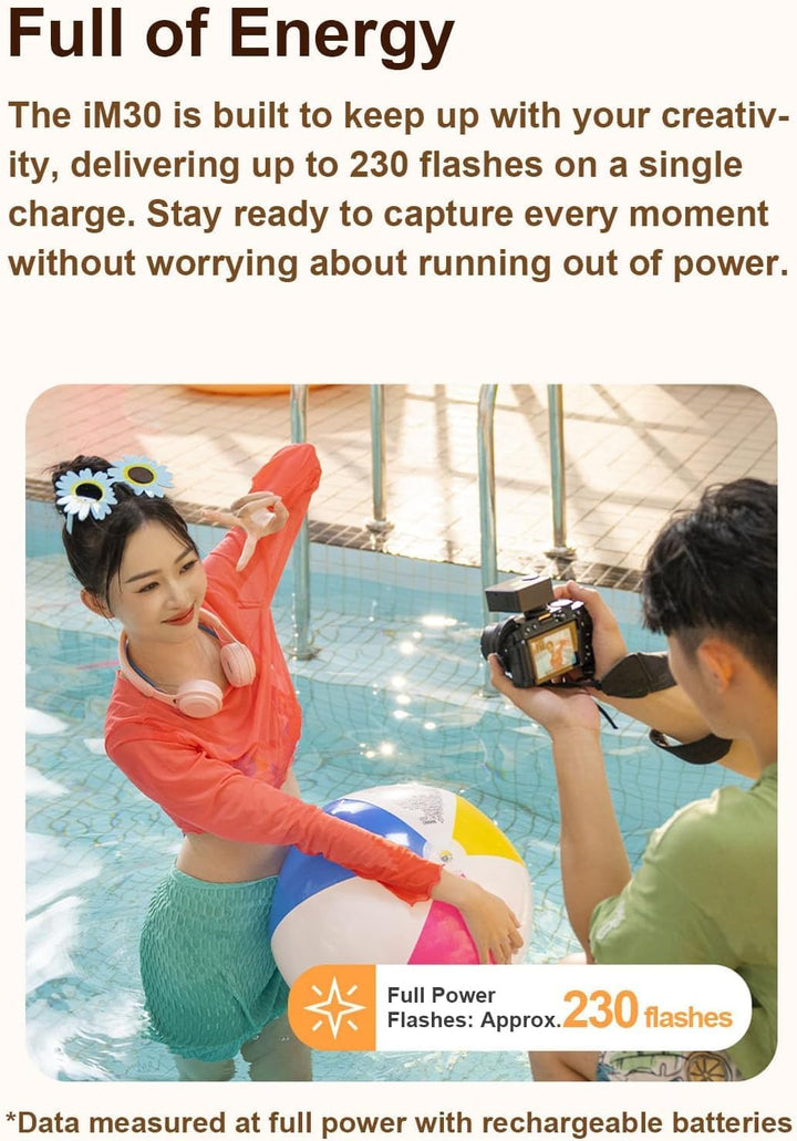 - GODOX IM30は、携帯性を重視する写真家に最適なコンパクトで軽量なフラッシュです。パンケーキレンズなどの小型レンズとの相性が非常に良く、旅行や普段の撮影に最適です。ご注意:大型レンズやレンズフードと併用する場合、フラッシュの位置によっては被写体に影が映る可能性があります。最適な結果を得るには、小型レンズとの組み合わせをお勧めします。より高度なライティングが必要な場合は、プロ仕様のフラッシュモデルをご検討ください。