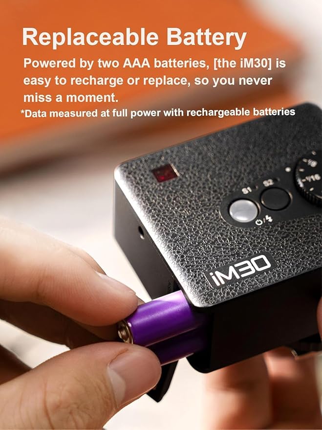 単4電池2本(別売)で信頼性の高い電源供給:Godox IM30ミニフラッシュは、1回の充電で最大230回の発光が可能です。電池交換も簡単で、長期間の使用でも電池の消耗を気にすることなくお使いいただけます。