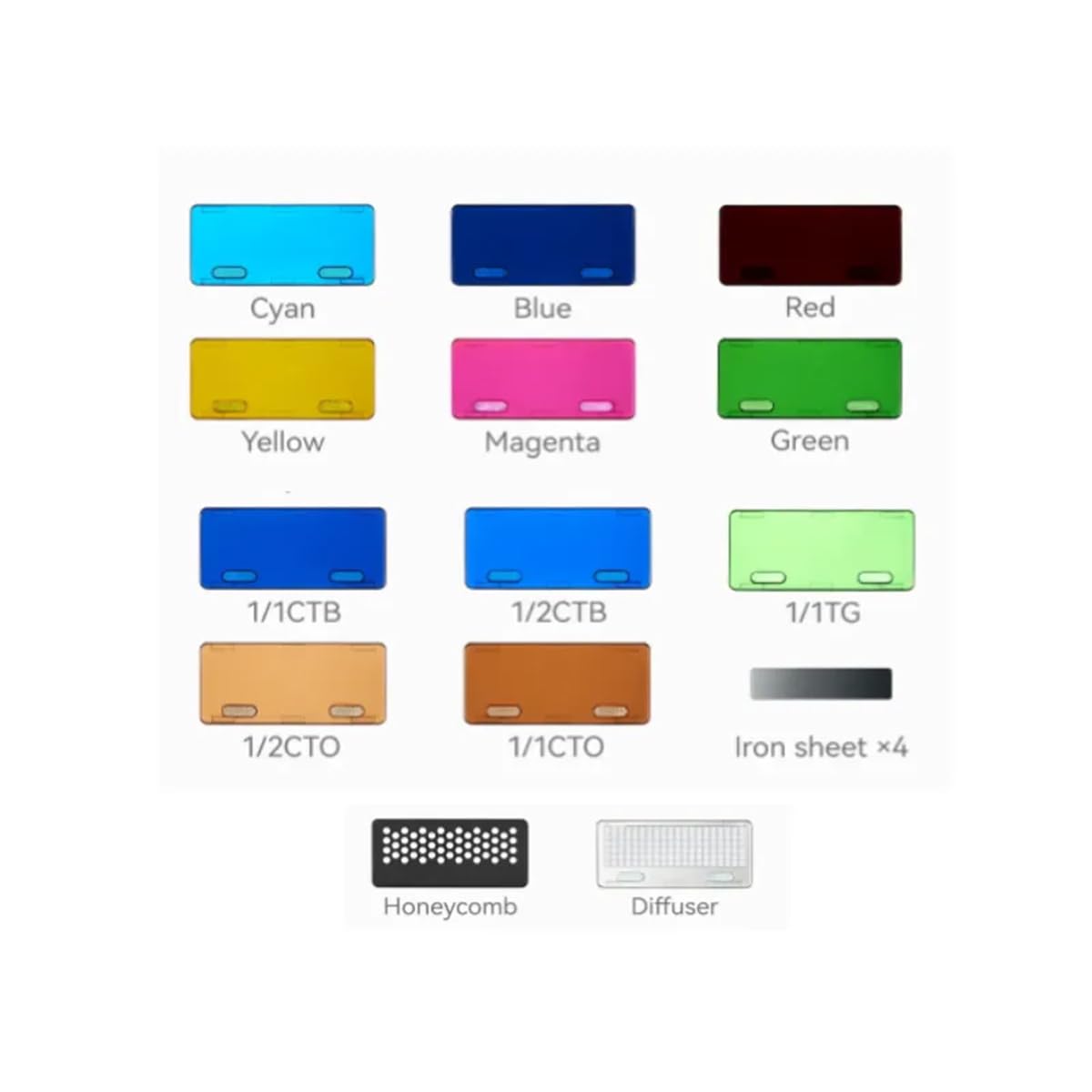 - 完全なセット (同梱物): ハニカム グリッド 1 個、ディフューザー 1 個、カラー フィルター 12 個 (フル CTB 1 個、1/2 CTB 1 個、フル CTO 1 個、1/2 CTO 1 個、TG (グリーン) 1 個、さらに赤、緑、青、シアン、黄、マゼンタのフィルター) が付属し、色補正とクリエイティブな効果の両方に最適です。