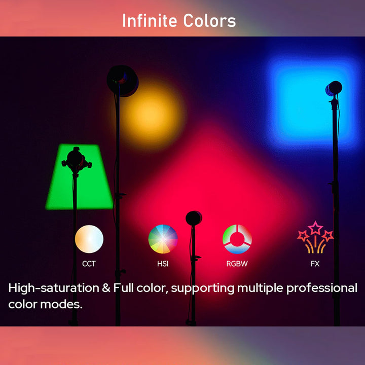 - 14種類の特殊効果:CCT、HSI、RGBW、FXモードから選択し、ニーズに合わせて精密かつカスタマイズ可能な照明効果を実現します。14種類の特殊効果は、フラッシュ、稲妻、曇り、電球切れ、テレビ、キャンドル、火、花火、爆発、溶接、パトカー、SOS、RGBサイクル、パーティーなど、ダイナミックな照明効果を実現します。これらの効果は、作品に無限の創造性をもたらします。