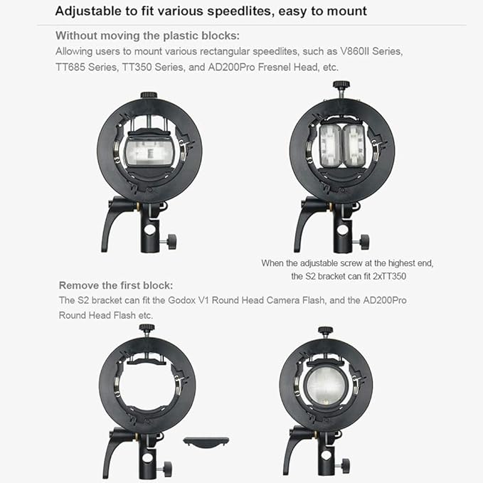Godox S2 スピードライト Sタイプブラケット Bowens マウント、Godox V100 AD200Pro II V1Pro AD200Pro AD400Pro AD200 V860II TT685 TT600 TT350用、精密チルトコントロール、大型ハンドル、一体型アンブレラマウント