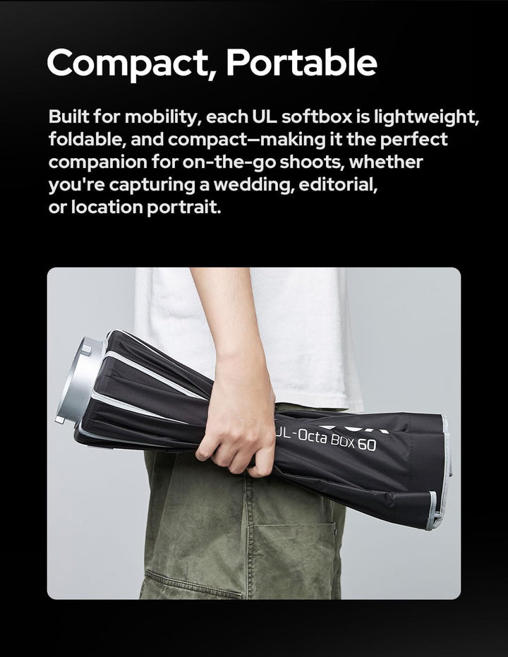 - コンパクトでポータブル: 移動性を重視して設計された各 UL ソフトボックスは、軽量で折りたたみ可能、コンパクトなので、結婚式、編集、またはロケーション ポートレートを撮影する場合でも、外出先での撮影に最適です。反射シルバーの内部は出力を増幅し、オプションの拡散プレートは鮮明なキャッチライトを備えたクラシックなビューティー ディッシュ照明を作成します。グリッドを取り付けるとビームが狭くなり、光の漏れを制御できます。