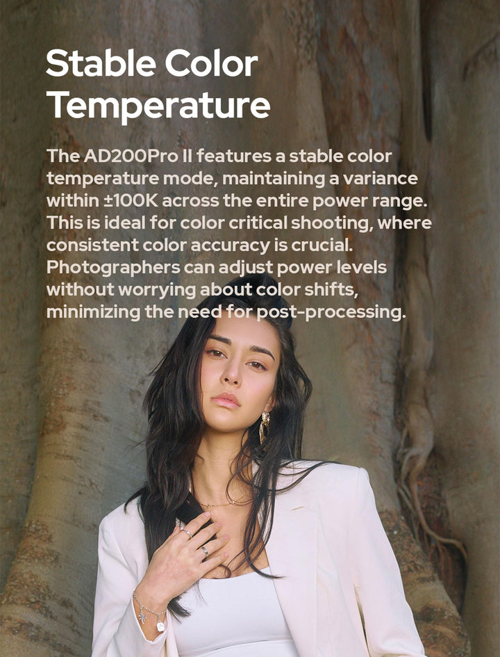 Stable Color Temperature Mode: The Godox AD200Pro II Includes a Stable Color Temperature Mode, Maintaining a Variance Within ±100K Across the Entire Power Range. This Feature Is Ideal for Color-Critical Shooting, Where Consistent Color Accuracy Is Crucial. Photographers Using the Godox AD200ProII Can Adjust Power Levels Without Worrying About Color Shifts, Which Minimizes the Need for Post-Processing and Ensures Reliable Results During the Shoot