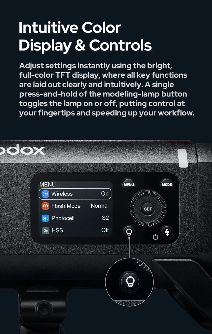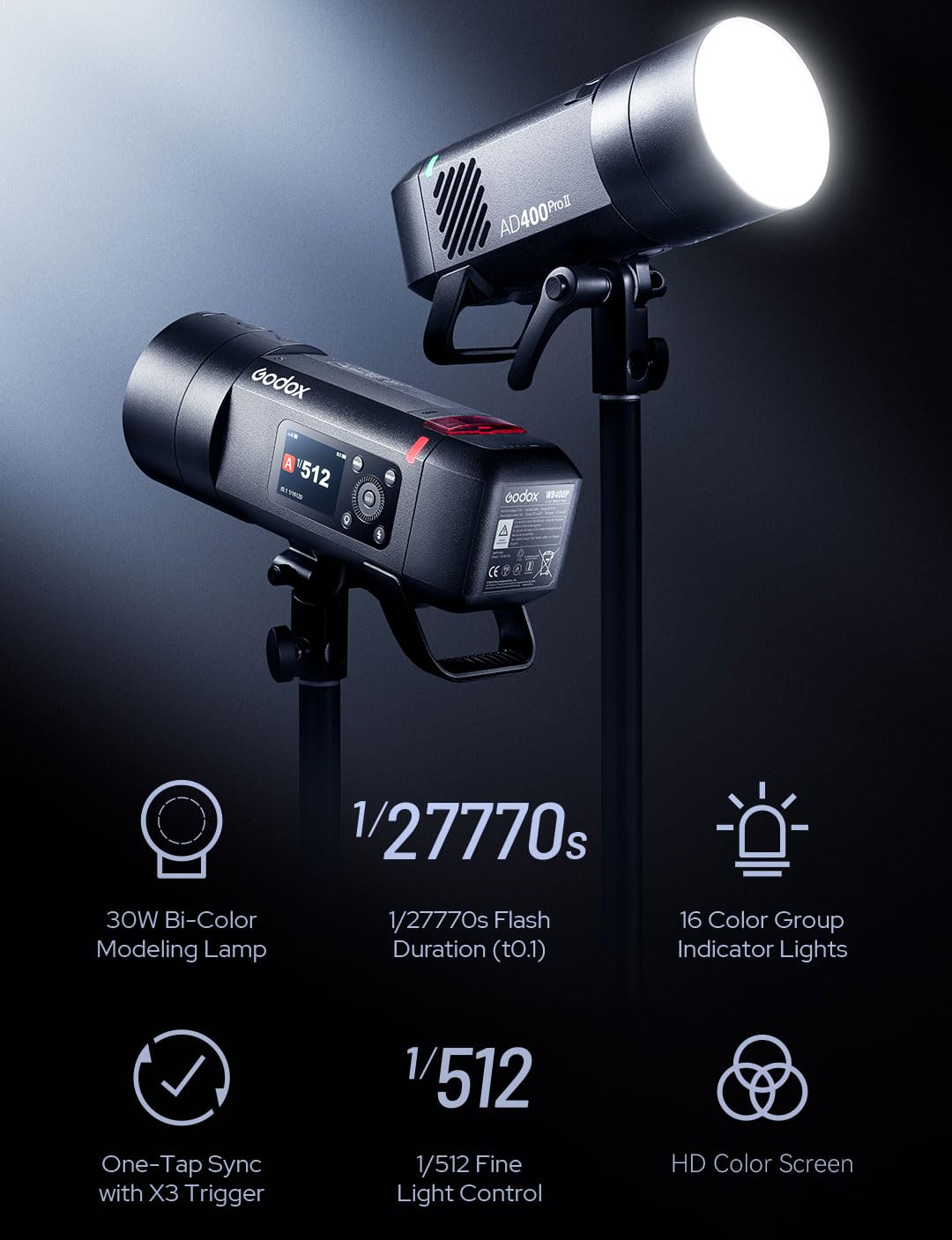 Godox AD400 Pro II AD400Pro II AD400ProII Flash, GN72 One-Tap Sync with X3/30W Bi-Color Modeling Lamp/Color Screen/16 Color Groups Indicator/Freeze Mode/460 Flashes/1/512~1/1 (with ± 0.1 Increment)