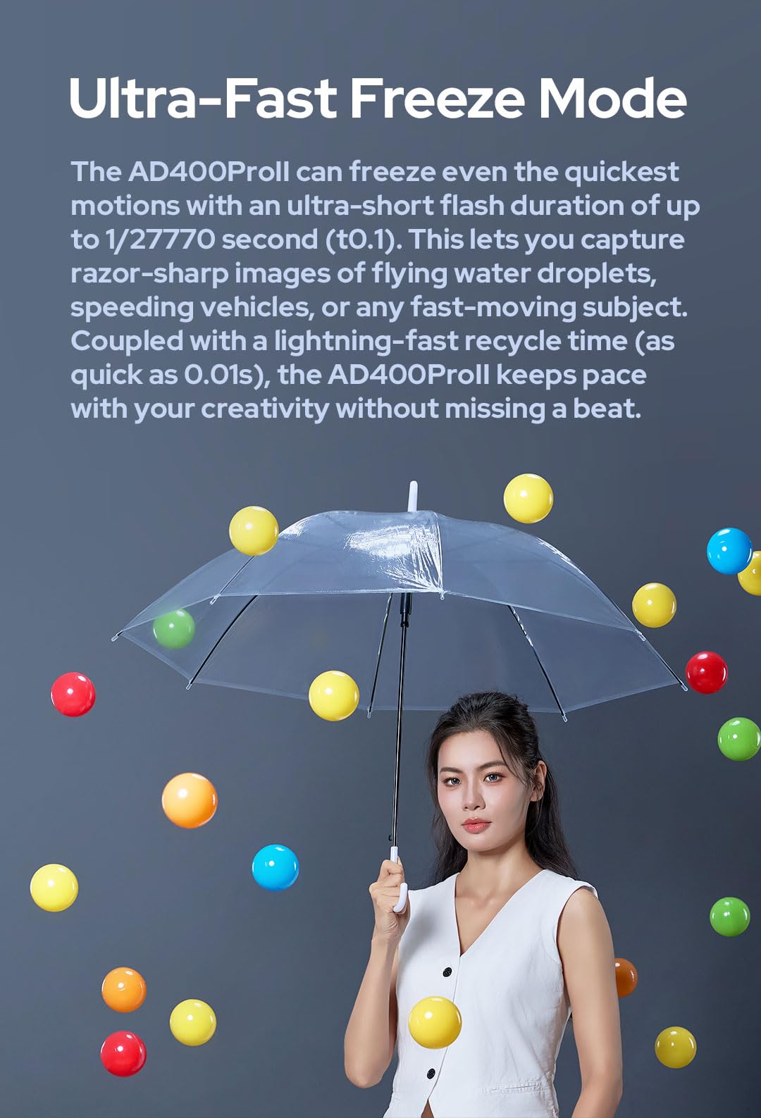【⚡ Ultra-Fast Freeze Mode】The AD400ProII can freeze even the quickest motions with an ultra-short flash duration of up to 1/27770 second (t0.1). This lets you capture razor-sharp images of flying water droplets, speeding vehicles, or any fast-moving subject. Coupled with a lightning-fast recycle time (as quick as 0.01 s), the AD400Pro II keeps pace with your creativity without missing a beat.
